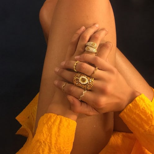 Gigi opted for statement-making rings bedecked in yellow diamonds to match her dress.