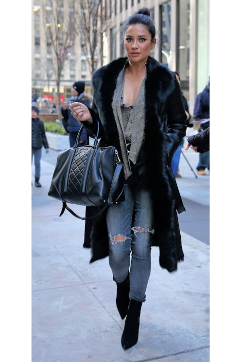 The texture in Shay's shearling-lined topper adds interest to the basic black hue. Punctuated with tonal accessories and a sleek topknot, the look is 100% city-girl cool.