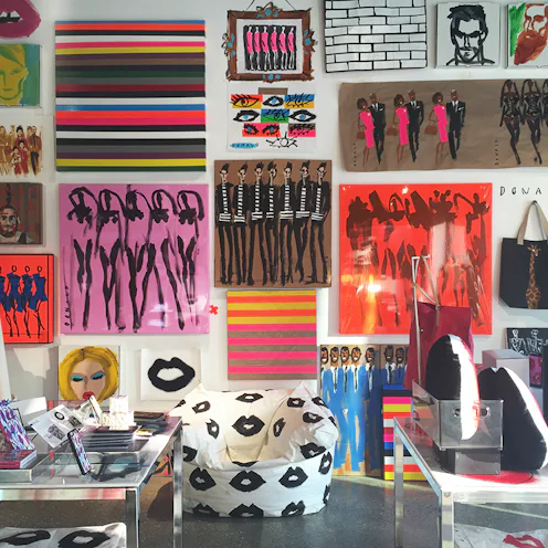 The Donald STORY also features original artwork from the too-cool creative, ranging from pop culture references (hello, The Fat Jewish) to Robertson’s signature lip prints. Mostly depicted on unexpected mediums—think pizza boxes and paper bag canvases—the imaginative brushstrokes are the perfect blend of cheeky and chic. Plus, the heavy dose of color is impossible to resist.