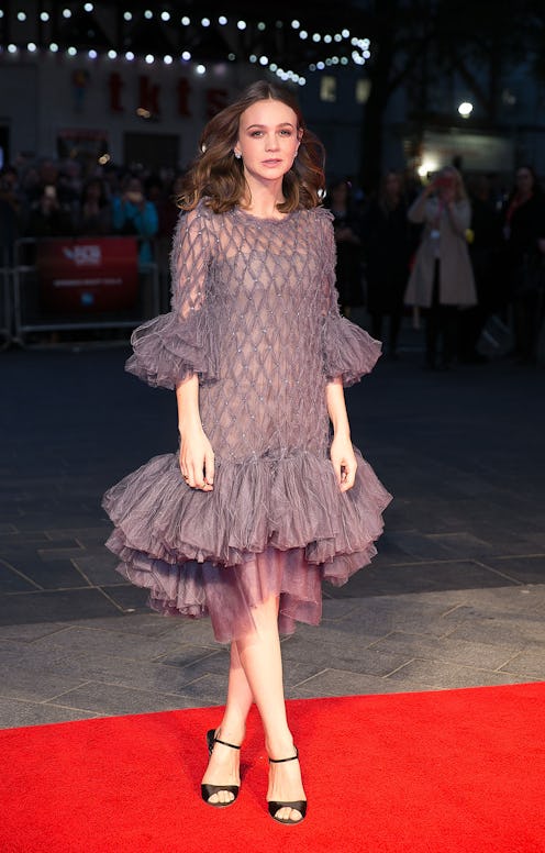 For the premiere of her upcoming movie Suffragette, Carey Mulligan walked the red carpet in London donning a dramatic dress from Chanel Haute Couture. This ensemble caught the attention of Rachel Zoe, because there is probably no one on the planet who loves Karl Lagerfeld and his stunning red-carpet designs more than RZ. And, of course, Carey pulls off couture like a cool girl pairing the tiered confection with effortless wavy hair and a subtle smoky eye in the same mauve-gray hue as her stunning dress. Classic black heels and simple diamond studs (hers must be at least 4 carats each!) always win when it comes to choosing accessories to wear with a dress or gown that has a lot going on.