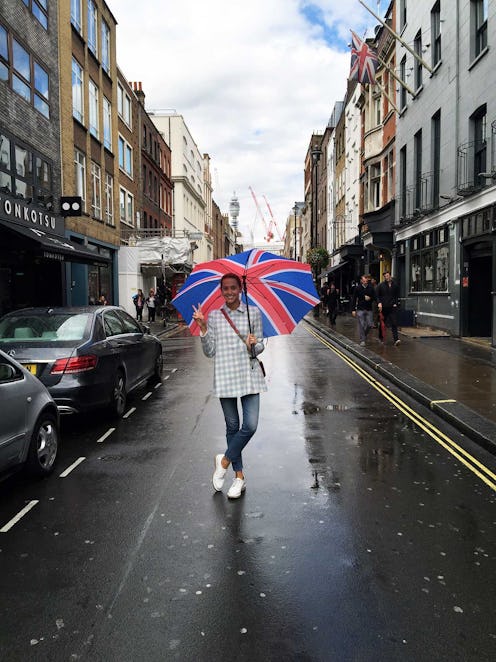 "Day one of LFW is (predictably) rainy! My Union Jack umbrella is beyond cheesy, but it does make for nice photos. I'm wearing a coat from Asos, jeans from Levi's Made & Crafted, shoes from a London brand I love called Purified and a Chanel bag."