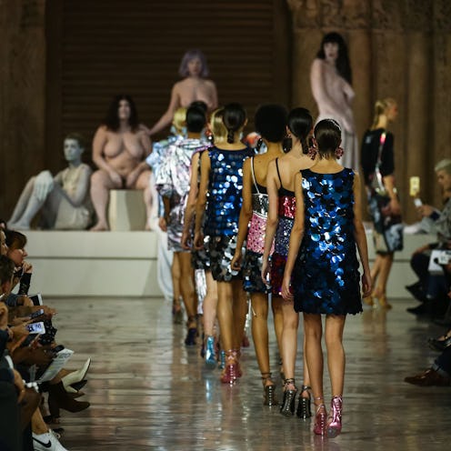 Kenzo designers Carol Lim and Humberto Leon experimented with the human element in their Spring 2017 show when they enlisted real people painted white, yellow and blue (à la plaster) to stand as naked sculptures at the Cite de l’Architecture et du Patrimoine. More than 20 dancers, aerialists and even a midwife managed to pose so still that it was hard to tell whether they were breathing (or whether attendees paid any attention to the models with the human sculptures at center stage).