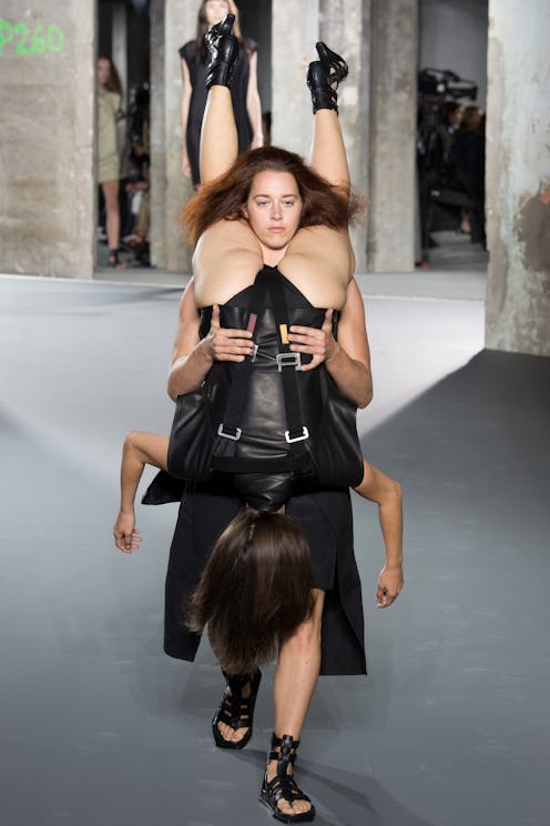 Upside-down models were worn harnessed like backpacks on Rick Owens' Spring 2016 runway.
