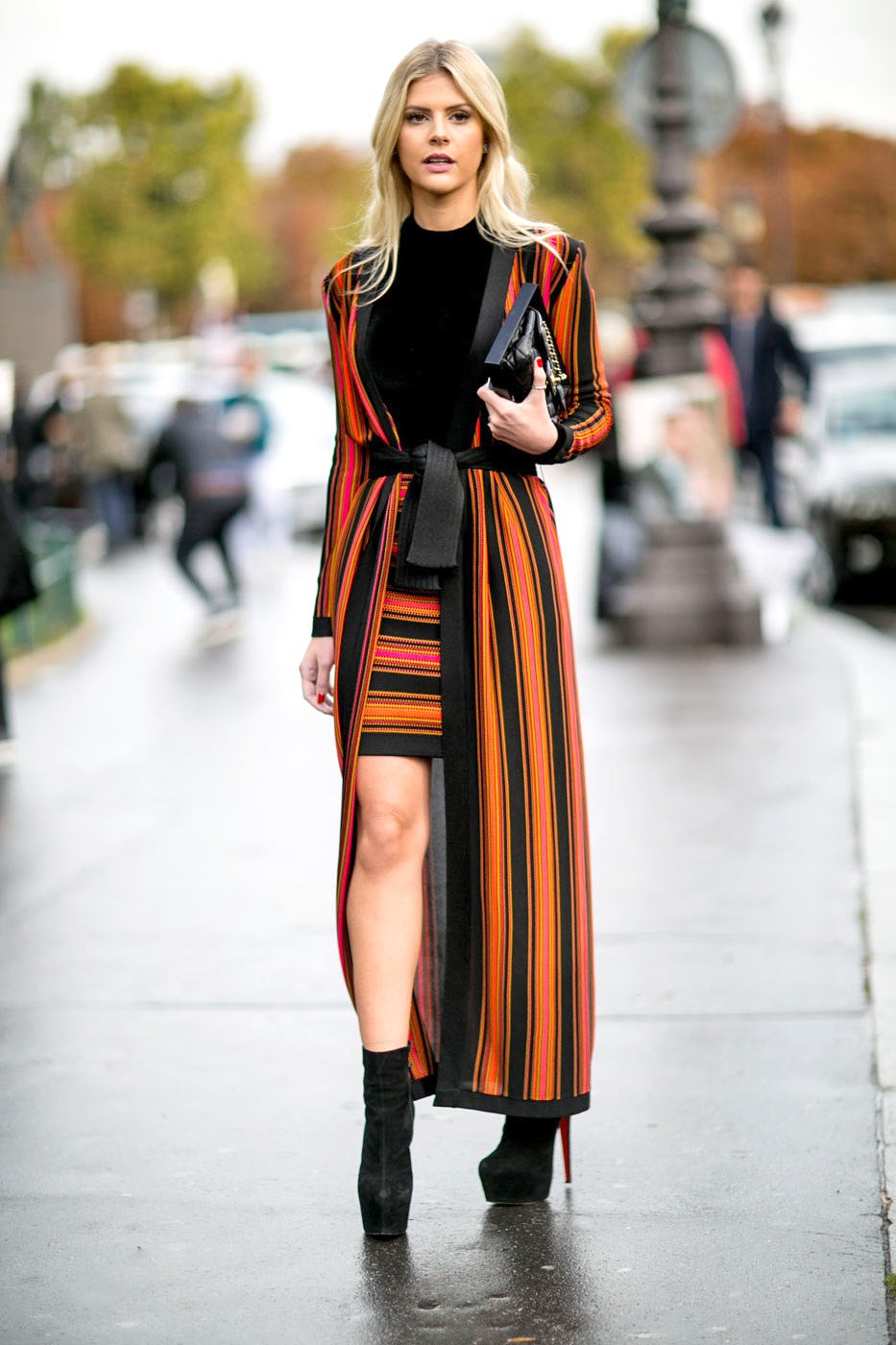 Pair your patterned coat with a patterned belt to break up the length of the coat.