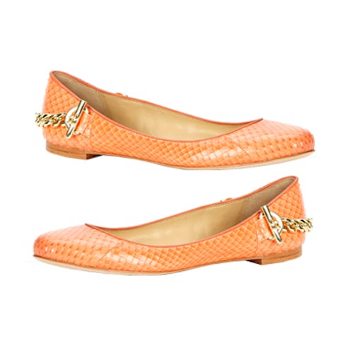 "Running errands never looked so posh as it does with these sleek snakeskin flats. Their chain-link back makes them all the more covetable."
