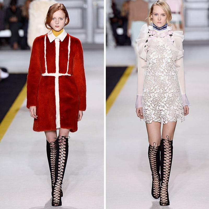 At Giambattista Valli’s show today in Paris, one of our favorite accessories strutted down the runway: Daring knee-high lace-up heels. The inherent edginess of this provocative style paired seamlessly with the elegant, feminine pieces that Giambattista is known for—making it work for the girl that has a penchant for all things rock’n’roll. Successfully nailing this look can be challenging, so use these styling tips and take the plunge—you’ll thank us when black lace-ups become your go-to.