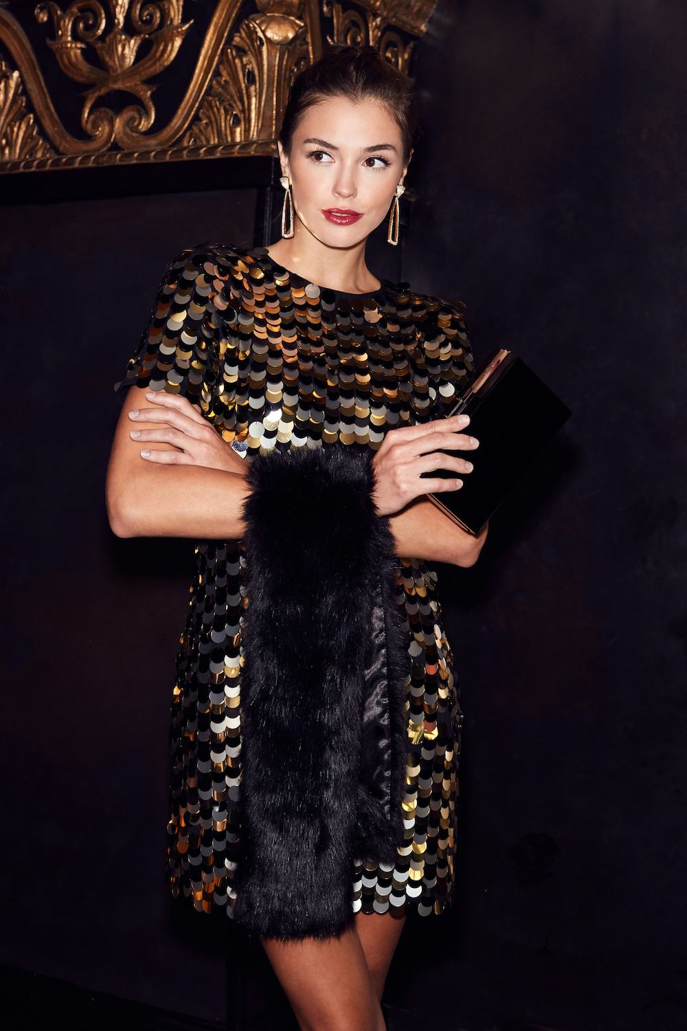 Complement allover disco sequins with luxe faux fur and our House of Harlow 1960's oversize head-turners. A messy updo, box clutch and stained red pout complete the look.