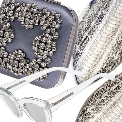 Pulling off a bedazzled evening clutch during the day is all about creating contrast. Use a diamonds-and-jeans approach and opt for slouchy distressed denim, paired with a gauzy t-shirt, snake-print mules and oversize retro sunglasses.