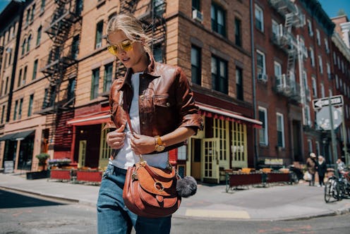 As the fall chill arrives, a leather jacket, cuffed denim and sneakers give the bag a cool downtown vibe. Top it off with a pom-pom keychain for a dose of whimsy.