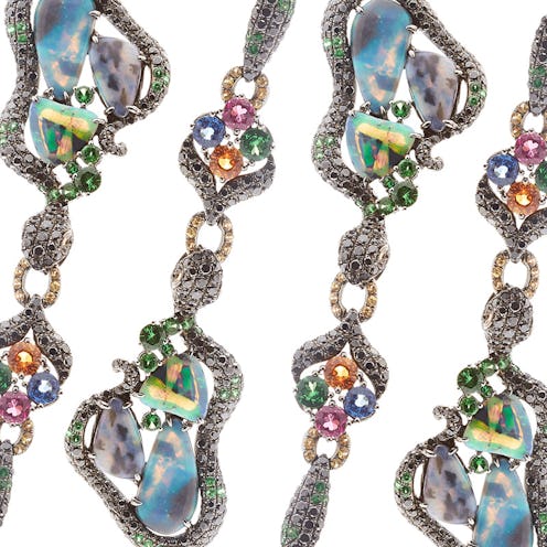 If these gorgeous multi-stone earrings from Wendy Yue don’t get your heart racing you must be made of, well, stone. The delicate one-of-a-kind pair boasts an array of black and white diamonds, blue and yellow sapphires, opals, rhodolite garnet and tsavorite (which explains the hefty price tag). Assuming you aren’t in the market to drop a serious chunk of change, try this more affordable style for your next night out. Keep everything else monochromatic to allow the colorful gems to take center stage.