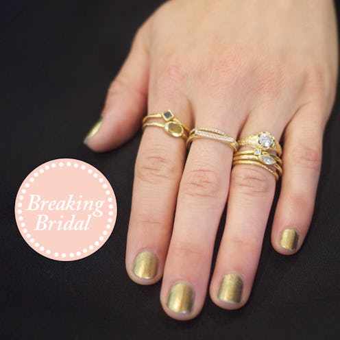 If you have a bunch of gold stacking rings from your pre-engaged status, don't let them sit in a jewelry box! Try wearing them across all of your fingers and stacked with your engagment ring.
