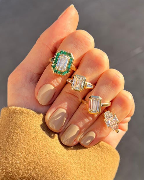 One reason labels are drawing on the flapper era for inspiration is that it was a time for jewelry with a striking, architectural feel. And if you apply this vibe to an engagement ring? You’ll get a graphic and linear style that feels so pertinent for today. The look features geometric shapes, and surrounding diamonds either as a halo embellishment or band detail. There’s also plenty of emerald or antique cut diamonds, the former of which is an especially striking choice due to its angular details and ability to highlight the color of the stone.