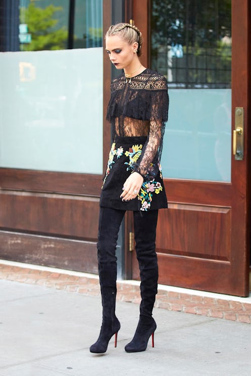 A true fashion chameleon, Cara Delevingne embodies a host of different style sensibilities, easily segueing from tomboy chic to darkly romantic and back again. That said, she rarely enters saccharine territory—if ever she’s rocking something overtly girly, it will usually be offset by otherwise edgy add-ons. Take, for example, her recent affinity for lace—a fabric that can read prim and feminine, Cara demonstrates how to spin it to complement a moodier attitude. Here, two takes (on the same lace blouse!) to try if the thought of a sticky-sweet outfit makes you run for the hills.