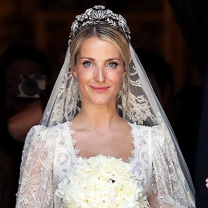 Ekaterina donned a bespoke Sandra Mansour Chantilly lace gown with a full-length train and hand-embroidered veil, looking every bit the real-life princess she is. It's no surprise the bride chose the designer; the two are friends from London, where Ekaterina runs her own fashion brand, Ekat. Of course she completed her look with the prince's family diadem, an heirloom that formerly belonged to the daughter of Germany's last kaiser. So regal. Sigh.