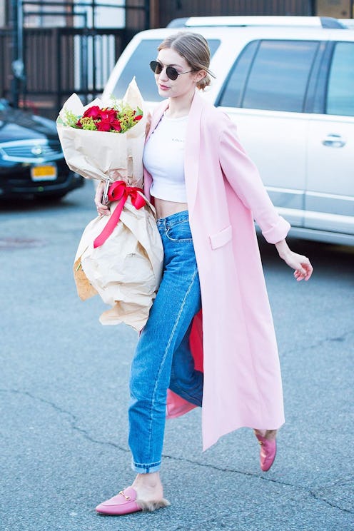 Millennial pink has become a phenomenon in both the fashion and political spheres. More than just a pretty hue, the color has kicked its girly connotation to the curb in place of a powerful, feminist presence. Trendy wardrobe pieces rendered in the blush shade have become some of the season’s most covetable, as style stars like Gigi Hadid offer fresh inspiration. Case in point: The supermodel rocked a pink duster with a cropped tee and jeans while out and about in New York City for her 22nd birthday. But what made her outfit even cooler were her statement-making (matching!) pink slide-on loafers. Try Gigi’s styling trick by scoring our favorite pink picks ahead.