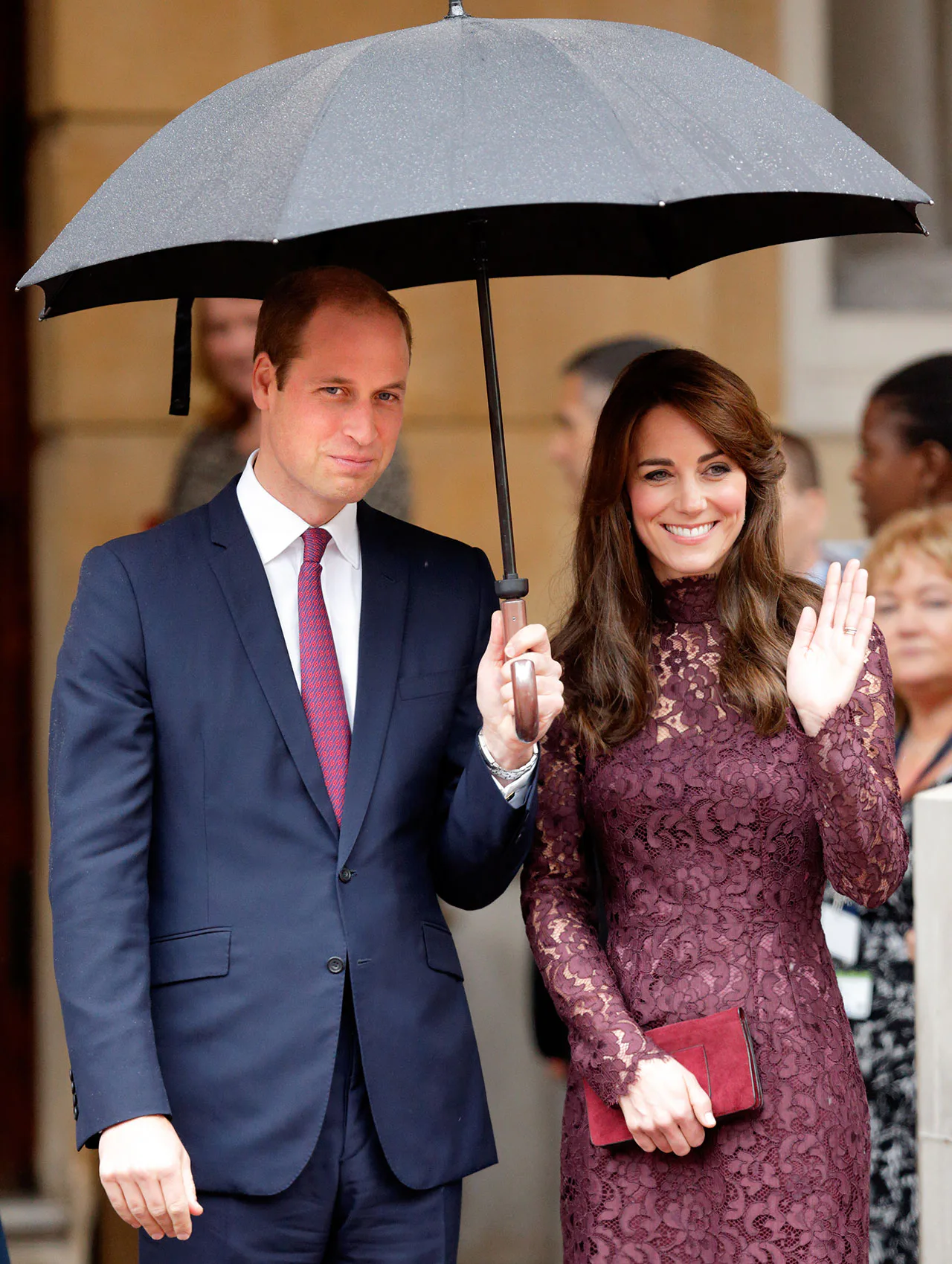 The Duchess of Cambridge is on a roll this week! After rocking an extravagant diamond and pearl tiara at a state dinner yesterday, Ms. Middleton stepped out in a plum-hued lace dress today continuing her sartorial winning streak. Lace can be a particularly difficult fabric to pull off and easily veers either too bridal (in cream or white) or too risqué (especially in red). Of course, Kate nailed this trend effortlessly styling the jewel-tone Dolce & Gabbana frock with monochromatic accessories: Her minaudière and suede pumps in deep burgundy were the perfect compliment. This is how you do lace for fall in the classiest possible way.