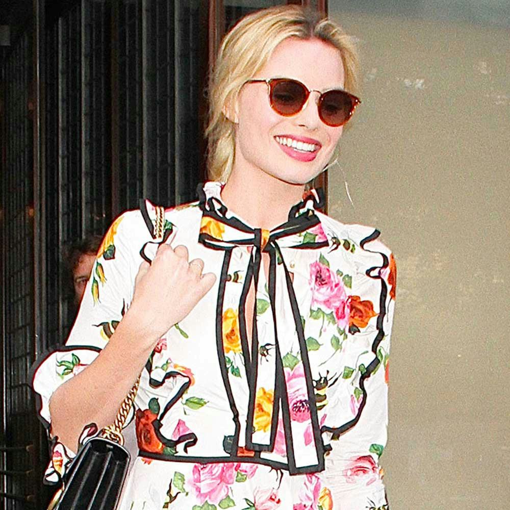 Margot Robbie is on one heck of a sartorial winning streak (largely thanks to celebrity stylist Kate Young). She stepped out in NYC today in a frilled floral-print Gucci dress with tiered ruffles—a darling look akin to Beyoncé’s and Blue Ivy’s recent twinning extravaganza. The ultra-feminine frock is as pretty as can be, and also proof that while florals may not be “groundbreaking,” they’re certainly alluring, and can be achingly modern on account of the contrasted black piping and low-key beauty look. While this prim and proper silhouette could seem stuffy, her ensemble feels refreshingly fuss-free, with T-strap platform heels (the sky-high height is making a comeback), a chain-strap shoulder bag and retro shades. Since we’re lacking the funds to keep our own personal stylist on staff, we instead have picked out four affordable dresses that embody Margot’s gorgeously girly garb. Wear them now with your favorite pair of pumps and sunnies to get through the heatwave, and swap for knee-high boots and a layer of tights come fall.
