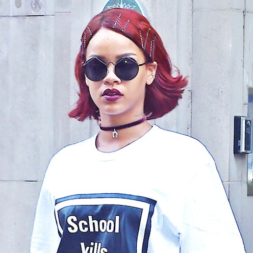 Rihanna is known for her constantly changing hairstyles but when she stepped out in NYC yesterday, she caught our eye yet again. Although she has been rocking a red ‘do since Coachella’s first weekend, her hair is looking a little more burgundy with a lot less of the length. Channeling her inner ’90s teen queen, she goes full grunge with a shade of equally dark lipstick, a handful of bobby pins to accessorize her flipped-out bob, a velvet choker and round sunnies. Our only question now, what will she look like when walks the carpet tonight at the Met Gala?