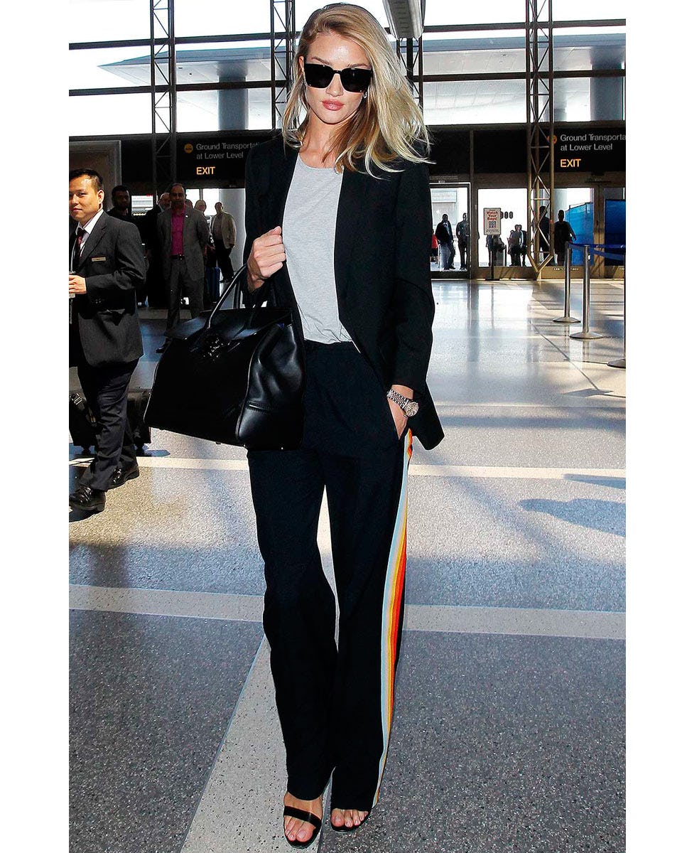 If the phrase ‘business suit’ conjures visions of boxy shoulders and pleated slacks à la Melanie Griffith in Working Girl, we totally understand. Office-appropriate separates are tricky to pull off but are a non-negotiable for those who work in a corporate setting. Which is why Rosie Huntington-Whiteley’s recent airport ensemble caught our attention. The style star opted for a classic black blazer-and-trouser combo over a sleek gray tee, but the genius is in the details. The tee (which could easily be replaced with a polished white blouse), is pristine and of good quality, the blazer is tailored to perfection and the wide-legged pants feature an on-trend sports-inspired stripe for a dash of personality. Finished with monochromatic accessories—an oversize menswear watch and glossy black sunnies—and the resulting look is modern not stuffy and worthy of emulating, stat. Just be sure you promptly arrive wherever you are going—running late doesn’t vibe well with this bossy ensemble.
