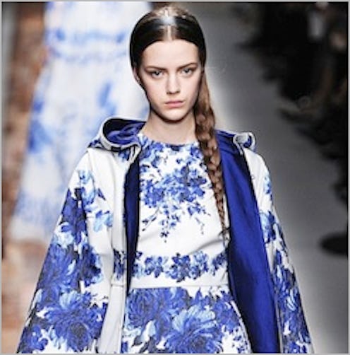 As the cozy, staying-in season draws in, we’re finding ourselves inspired by home decor in more ways than one. Valentino‘s modern take on classic porcelain patterns is a gorgeous way to wear florals in the winter season, without resorting to brooding black and brown motifs. Take inspiration from the runway look then shop our favorite blue floral finds in stores now!