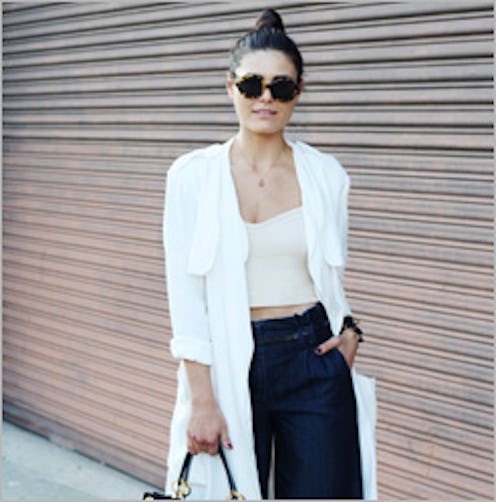 How she wears denim… “I am all about mixing high with low and vintage with modern. I love wearing these jeans with a simple knit tank, a silk trench I got at Zara and my Balenciaga Lune bag.”