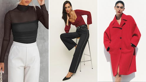 Once temps drop, assembling the ideal date night outfit becomes infinitely more tricky — and you may already be stumped. Here, though, you'll find chic winter date night outfits already planned: Anxiety-reducers and statement-makers combined, these pieces can help you dress to bring out your best self and stay warm. Look for statement outerwear (to make a good first impression) and lean on sheer panels, pops of skin, studs, and other bold, sexy touches that’ll balance out more covered-up outfits. And then there's color: Classic black and bold red — or burgundy, a sophisticated take on the standard that’s in every fashion girl’s closet this year. Scroll on to shop the cuffing season edit.