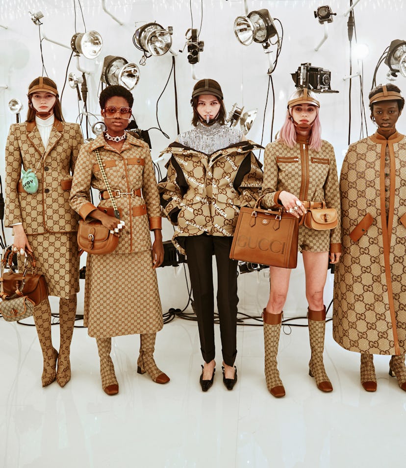 Alessandro Michele has crafted his own distinct era at Gucci — one full of exuberance and art. But, as the brand marks its 100th anniversary, the creative director transformed Gucci’s Fall/Winter 2021 “Aria” collection into a celebration of his predecessors and collaborators including Tom Ford (who helmed Gucci from 1994-2004) and Demna Gvsalia, currently creative director of Balenciaga. To the swell of Lil’ Pump’s 2017 hit ‘Gucci Gang,’ models walked a slick white hallway surrounded by flashing cameras — it was past, present, and future all at once.
