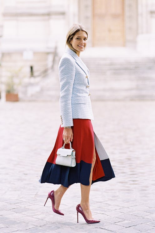 Team a cobalt blazer with tailored, printed pants and finish with sharp black accessories.