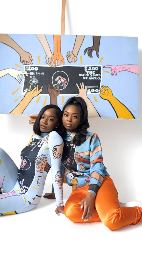 The result was the fully-collaborative TIER's Project 3: Joy to the World, an experience that includes all new art from Jean-Baptiste. "It was a little difficult at times," Jean-Baptiste says about working with another brand. "But I take criticism really well so I was fine with starting all over again if we needed." After several drafts, a selection of outerwear, women's dresses, and of course, sweats adorned in images portraying Black joy, pain, and dollars was created. "We wanted to highlight the power of the Black dollar in particular," Ealey says. "That's why the hands reaching for it are different colors. We wanted to display the way that we impact culture. Nothing progresses without our creativity.