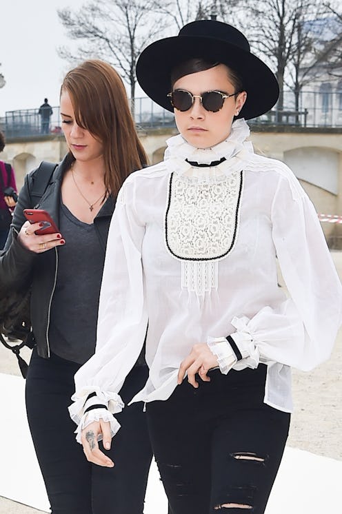 Cara sports her retro-inspired blouse in a way that reads totally rocker chic.