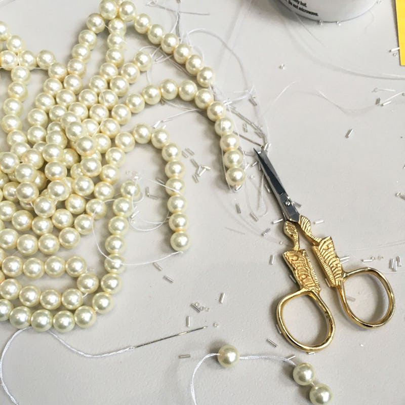 Once the gown was sent to the design studio in New York, RZ's team tweaked the original design by making it sleeveless and adding a wide crystal bugle strap, laddered pearls at the neckline and draped pearls at the shoulder. To ensure a perfect match with the handwork done in India, additional pearls were sent to New York for the finishing.