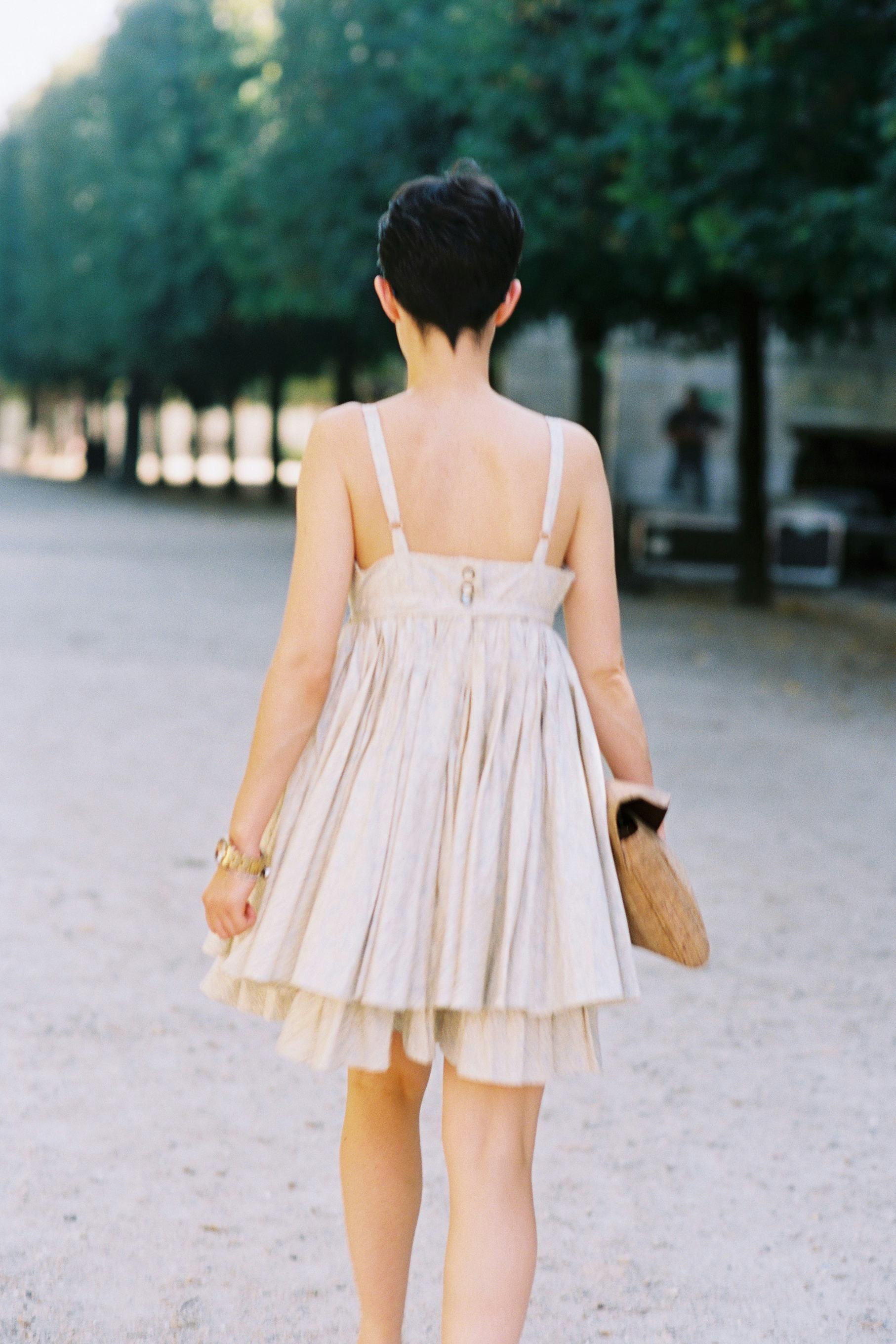 For backyard get togethers we adore this feather-light, tiered dress but suggest topping it with a denim jacket to stave off the evening chill. Add embellished sandals and a playful, mini bag.