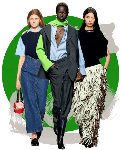 This week, no style stone was left unturned, with designers taking big risks that painted a fresh vision for the near future: clothes that fully express one’s personality, be it by way of a quirky hat or a sensually cut suit. Corset-like denim skirts and cinched jean dresses — seen at Bally and Fendi respectively — offered a more feminine alternative to your basic blues; Gucci and MM6 Maison Margiela’s thigh-high, leg-hugging leather boots invited us to keep micro hemlines in rotation, at least another season. And fringe-y finishes, a standout on multiple runways like Bottega Veneta and Ferragamo, made myriad silhouettes feel more thrilling to wear.