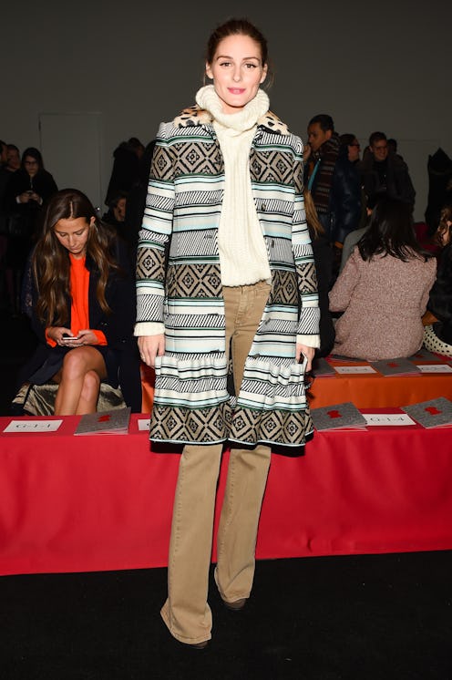 Olivia donned a patterned coat from Diane von Furstenberg's Pre-Fall 2015 collection at the designer's show. That animal print collar? Everything.