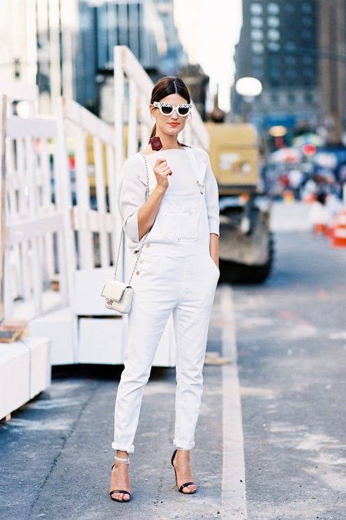 Denim overalls get an update in stark white. Wear with a printed crop-top, black leather accessories, and a bright, matte lip.