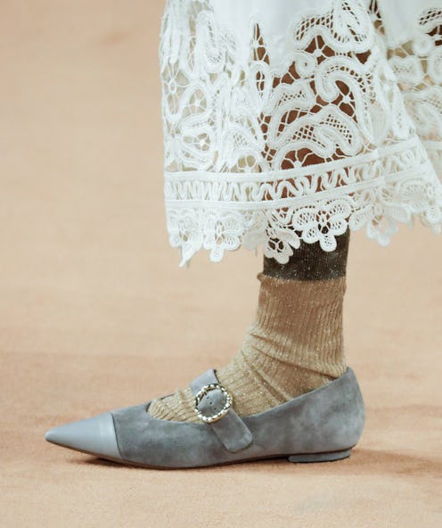 On Sunday morning, Ulla Johnson showed pointy-toe flats in various forms, from black Mary Janes with chunky buckles to a two-toned powder blue pair crafted from both leather and suede, styled with sparkly ankle-hitting socks. Meanwhile, Coach’s Creative Director Stuart Vevers is clearly a fan of the industry’s emerging coquette trend (which is all about flirty, feminine styles), considering he sent a red bow-adorned flat down the catwalk with a very sweet pastel pink pullover.