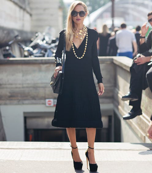 Leave it to our lovely Editor-in-Chief to make a simple black dress sing. This stellar street-style shot of her in Paris epitomizes her simply chic style: classic pieces taken to the next level through stellar accessories. Factor in the thoughtful gold accents, pop of berry on the lip and her signature flair for rocking vintage, and this ensemble is catapulted into serious lust-worthy territory. Herewith, everything you need to get this Rachel Zoe street-style look.
