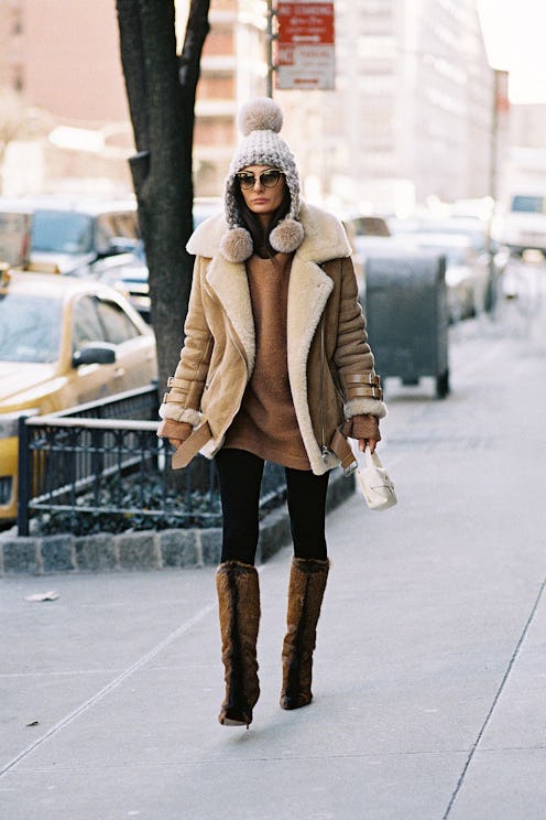 Style Leggings With: A chunky-knit sweater, shearling-lined boots and an oversize cocktail ring.