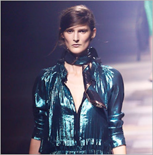 From Lanvin (pictured) to Rochas and Dries Van Noten, Paris Fashion Week was filled with memorable metallic moments. Get a jump-start on the spring trend by shopping a few of our favorite high-gloss pieces now!