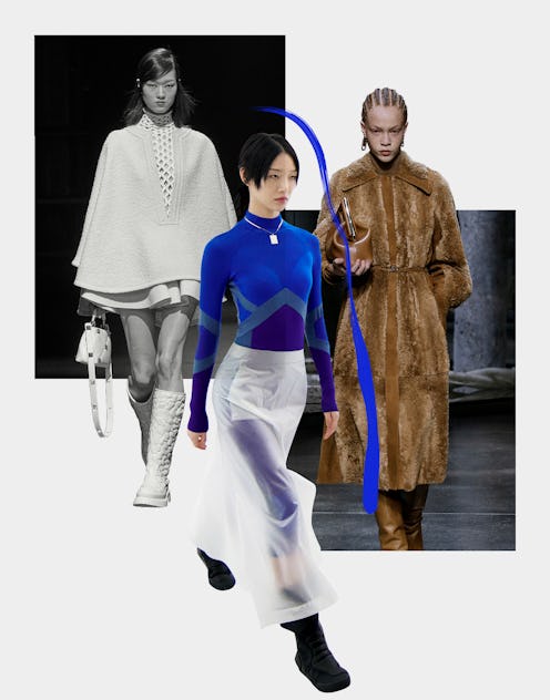 It wasn't just the literal inclusion of bright colors that heralded this happy aesthetic. The short hemlines, big furry coats, and oversized bags were all frivolous in the best way. When fashion has been about the physical — safety, comfort, and practicality — for so long, the time has come to make it more about emotion and opportunity. While there are still sleek neutral suits for the holdout minimalist, expect to see an explosion of lighthearted runway looks. Prada's lineup of colorful coats, Blumarine's nod to the '00s party scene, and Ferragamo's futuristic leather separates all set the stage for a whole lot to look forward to in the next six months.
