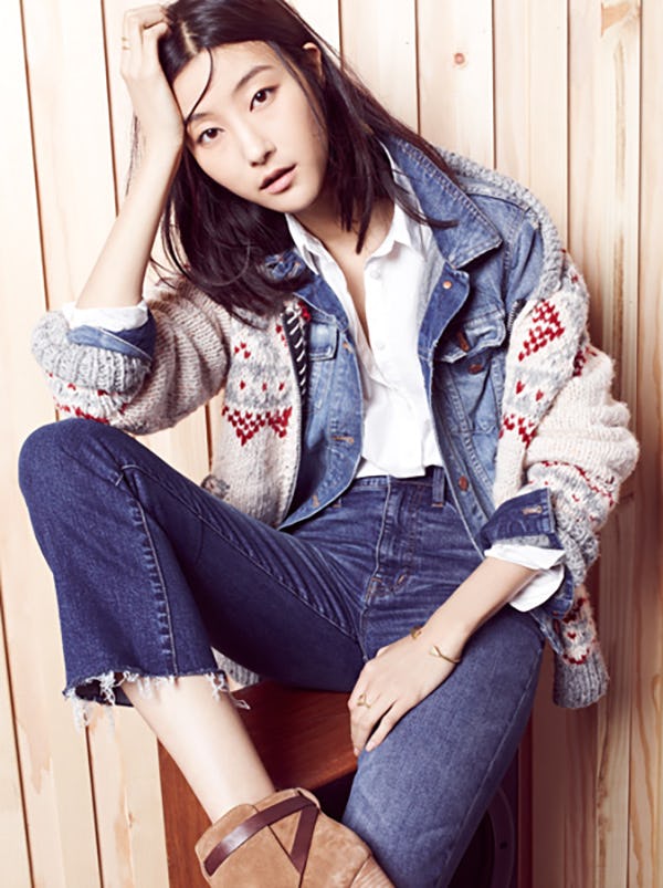 Chamula Fair Isle Cardigan Sweater ($330), The Jean Jacket ($118), Oversized Boyshirt ($75), 11" High Riser Crop Flares ($135)
