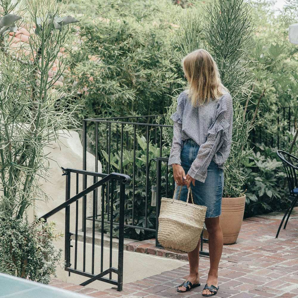 A petite floral print and raw-edge denim skirt are quintessentially '90s. A billowing fit on top nods to Clueless' Cher, while flounce details and neat accessories ensure a fresh effect.