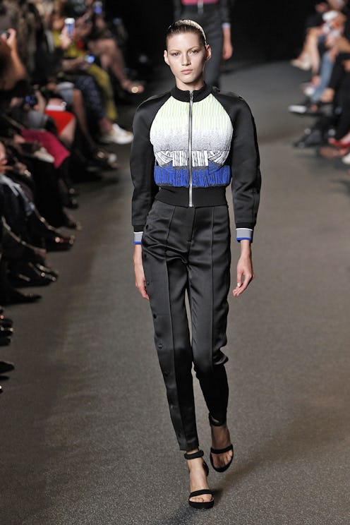 Fancy pants are not the first pairing that comes to mind when brainstorming the perfect complement to your sporty-cool bomber jacket. Leave it to mix-and-match master Alexander Wang to team a casual jacket with dress pants. Make the combo work for you by keeping the individual pieces neutral, relying on a sleek accessory for the sole pop of color.