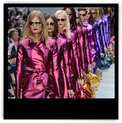 When we hear the name “Burberry”, the image that immediately comes to mind is that of a completely classic trench coat; the two terms are nearly interchangeable! This season, the British fashion house turned out the signature piece in mouthwatering metallic form, which offers a striking departure from your standard double-breasted coat, aka, we’ve never prayed for rain harder!