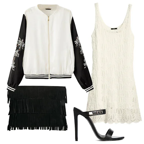 For a night out in the city opt for a palette of simple black and white. A silky baseball jacket makes a cozy topper for air-conditioned restaurants and waiting for a cab. Add a relaxed crochet dress, serious heels, and finish with a fringed clutch for a dose of whimsy.