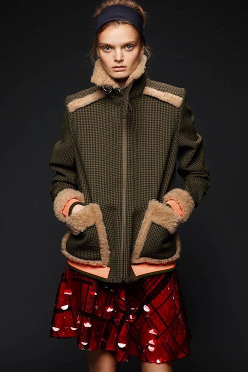 Preen by Thornton Bregazzi’s pre-fall 2015 collection was a mashup of cocktail attire and collegiate flair which is right up our alley. This mix-and-match look stood out as a great example of getting more mileage out of a sequined holiday dress. So this weekend, go ahead and top your festive frock with a crew neck sweater and a shearling bomber jacket. Finish with tights, combat boots and a thick headband for a casual, off-duty spin.