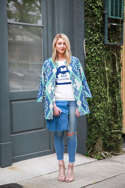 This casual-chic combination of a sweatshirt and jeans is elevated by a colorful, embroidered jacket.