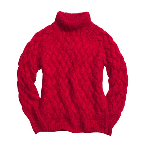 The reign of the cable-knit sweater continues with this fantastic mohair version. We anticipate pairing it with jeans for an afternoon of ice-skating with friends or an evening spent curled up by the fire. And don’t even get us started on the gorgeous color.