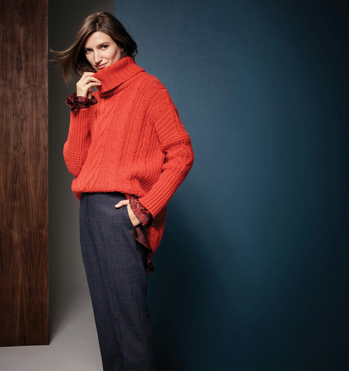 The bold shade is major this season. Choose a warm, nubby turtleneck sweater that's easy to pair with wide-leg trousers or denim.