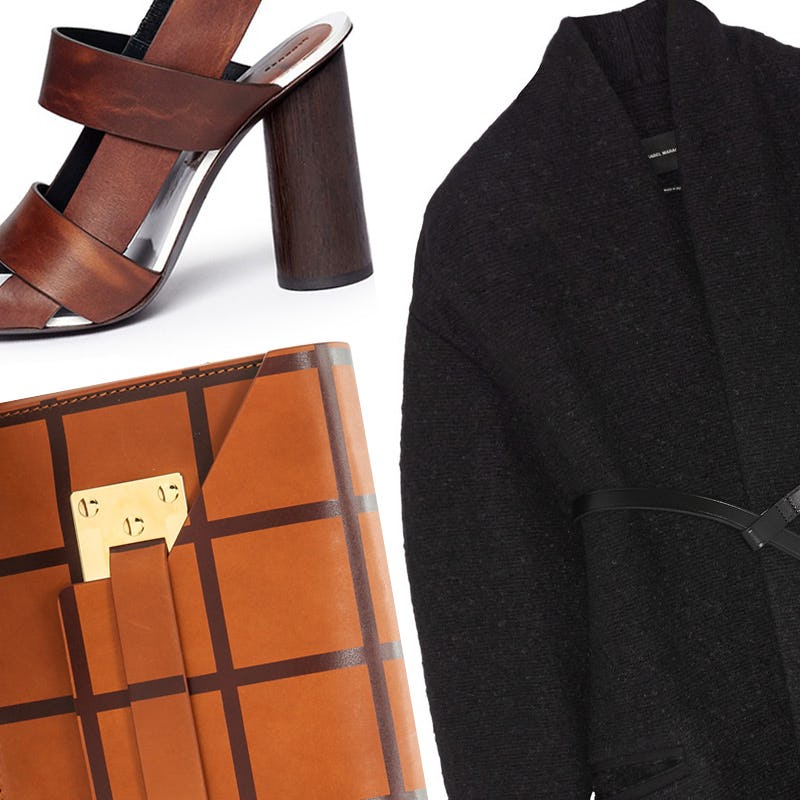 This sharp silhouette looks refined enough for the office while the warm russet hue adds interest to wintery layers like ribbed tights and a robe-like coat. Come spring you can wear it with lace-up gladiator sandals and gold cuffs for a modern spin on urban-safari style.